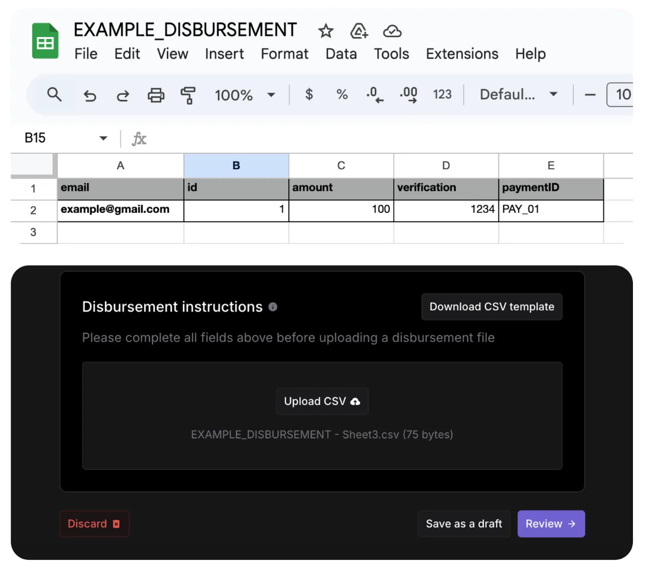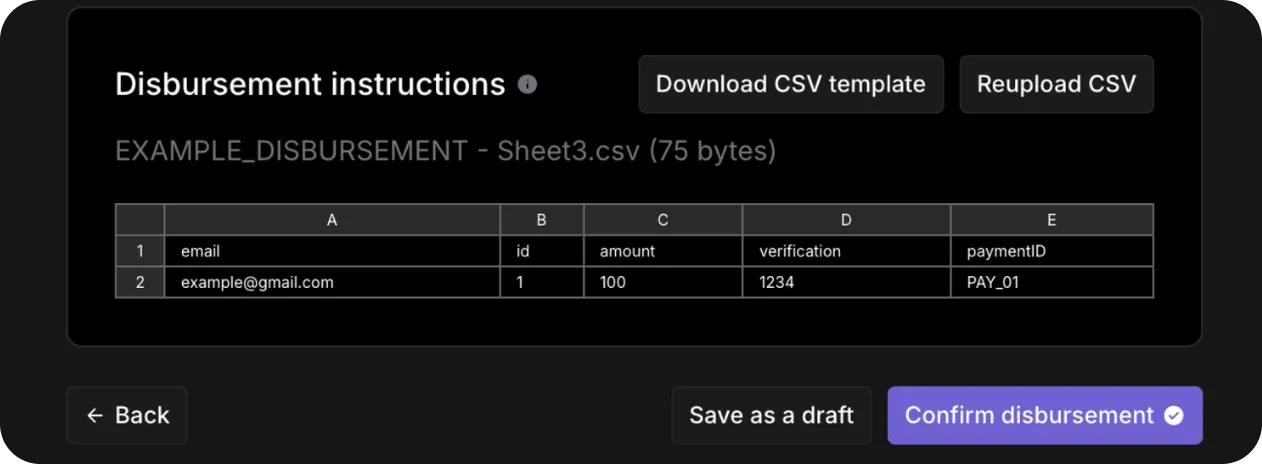Before creating a disbursement, the organization must prepare a structured list of recipients. This list is uploaded to SDP in CSV format.