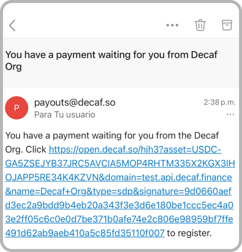 The beneficiary receives a payment email from “Decaf Org.”